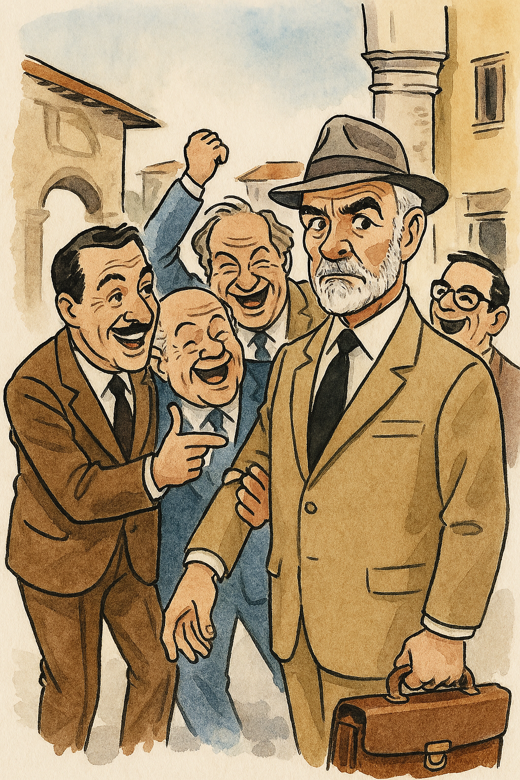 Sean Connery e Adolfo Celi hanno recitato assieme in 007 Operazione Thunderball, Celi ha poi recitato nella celeberrima saga di Amici Miei. Ho pensato che i due potessero essere rimasti in contatto e come Hackman fece in Frankestain Junior ho immaginato un cameo di Connery in Amici Miei.